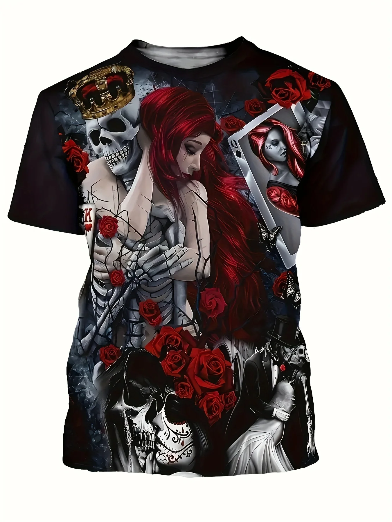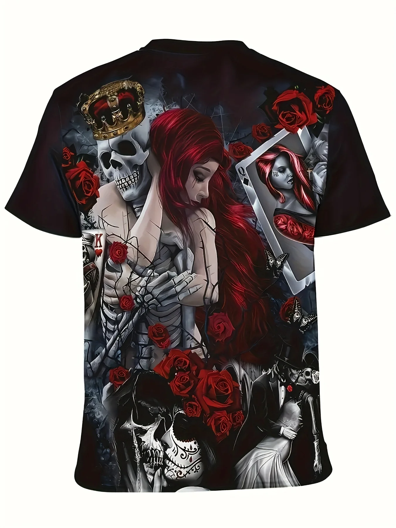 Men's Gothic 3D Skull and Red Rose Pattern T-Shirt Casual Short Sleeve Crew Neck T-Shirt Summer Outdoor Clothing Breathable Top