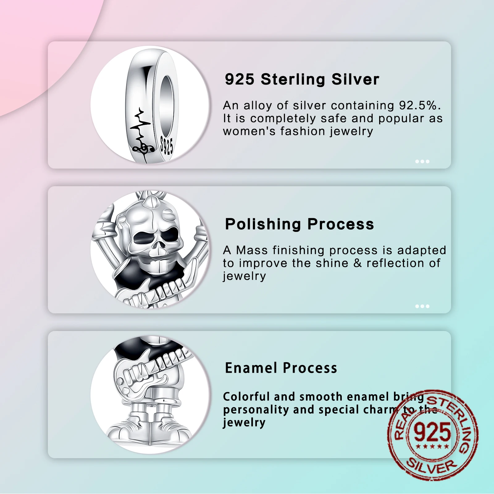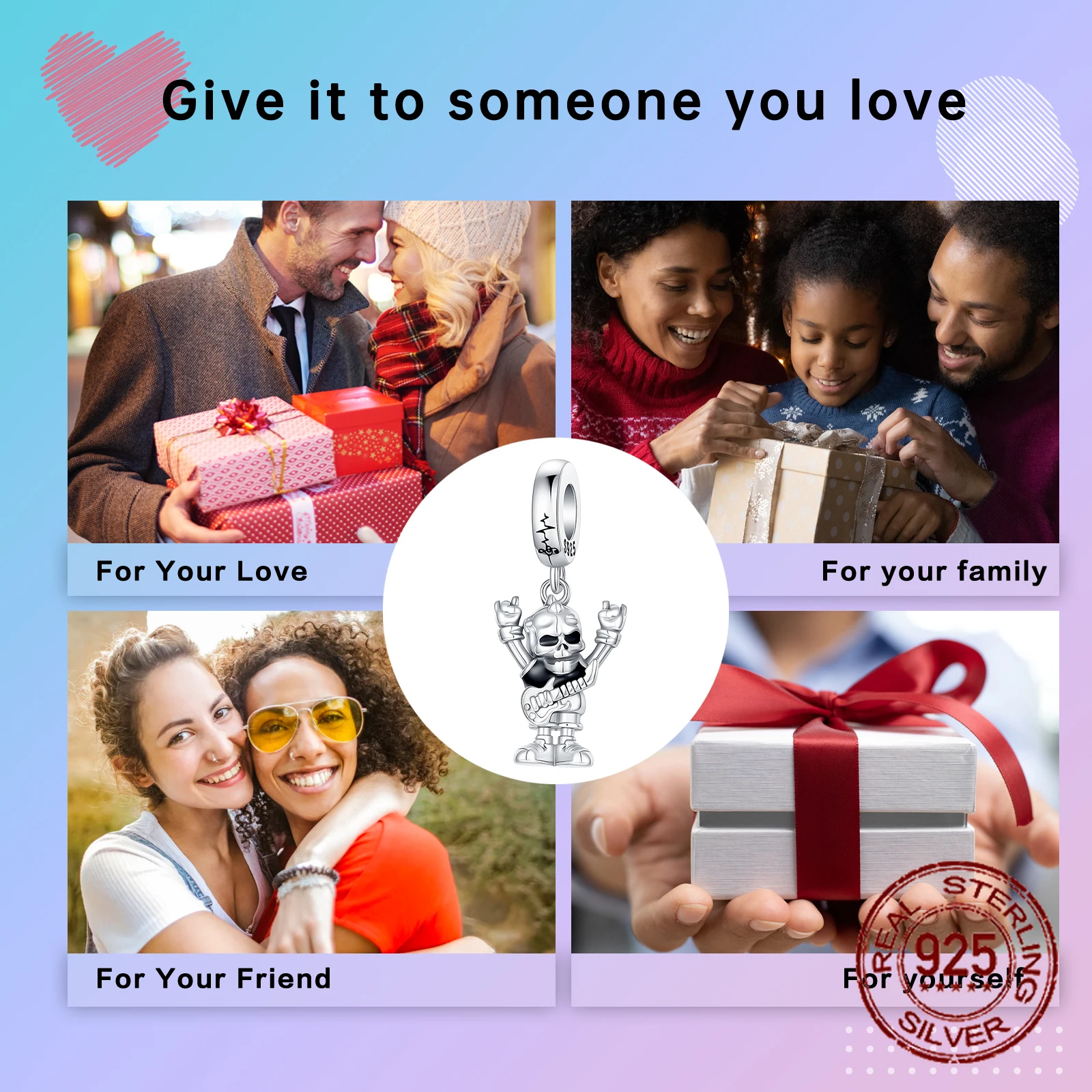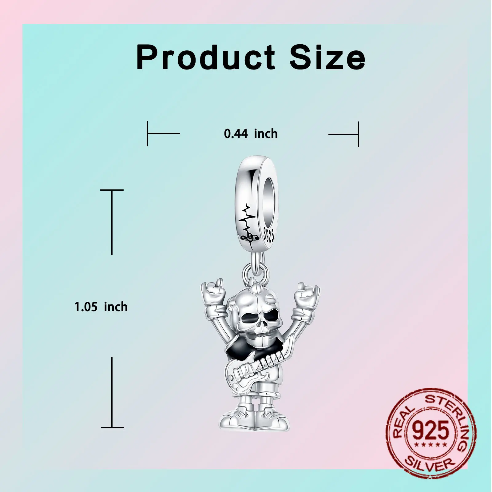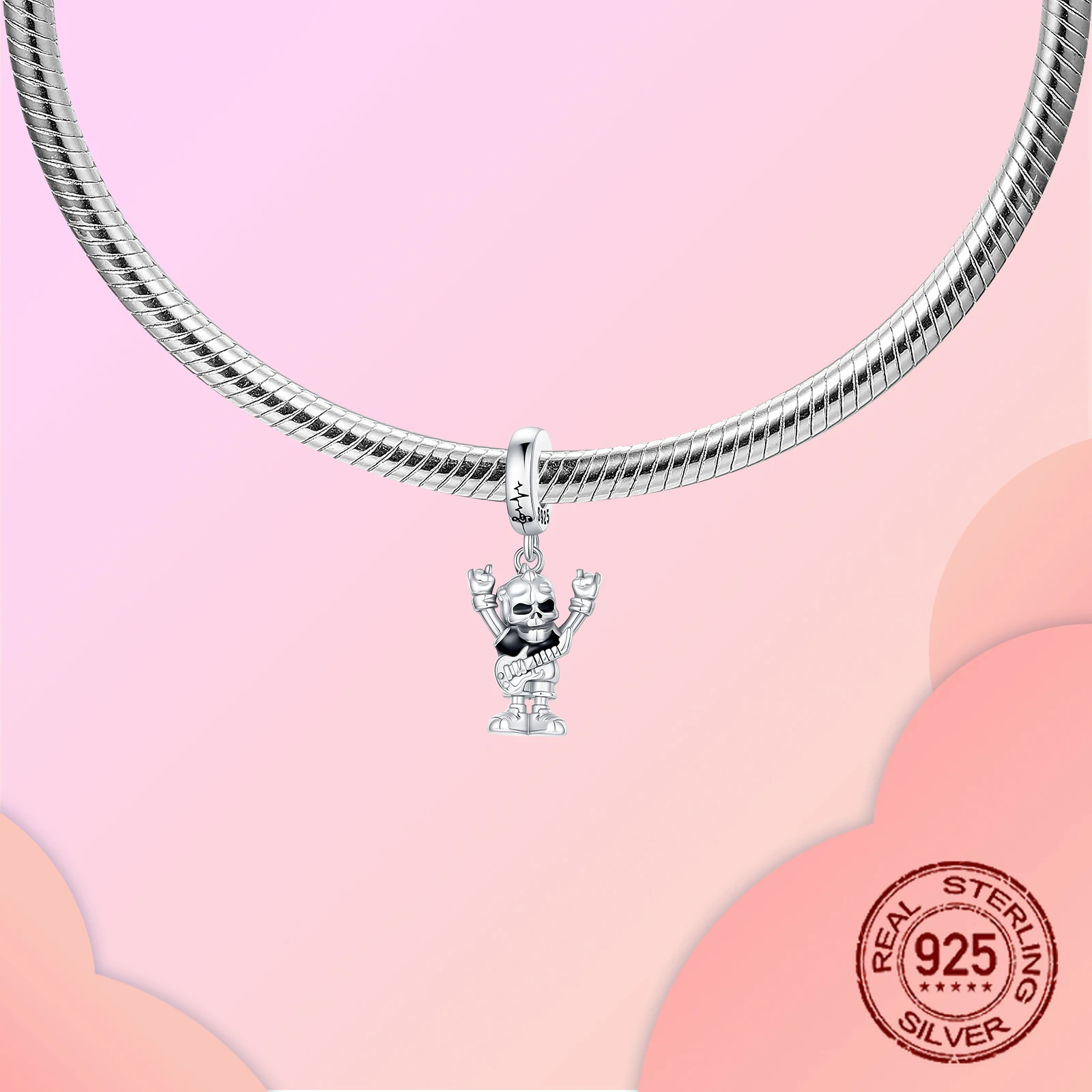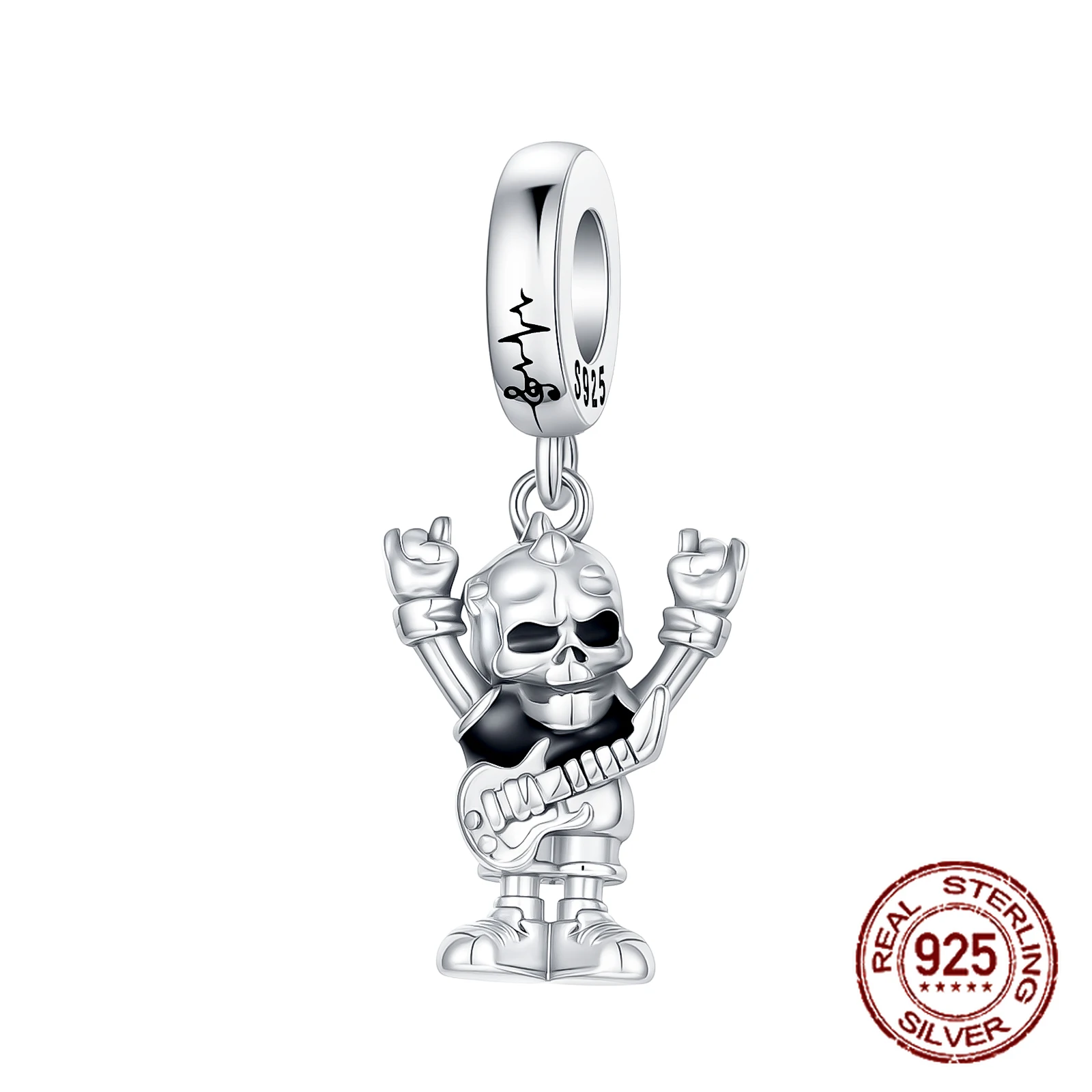 Rock Skull Dangle Charm S925 sterling Silver Guitar Rock Hand Gesture Design Pendant Fit Bangle Bracelet Necklace DIY Jewelry